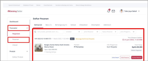 - Penyedia dapat melihat daftar pesanan yang masuk pada opsi Pesanan di menu Transaksi.