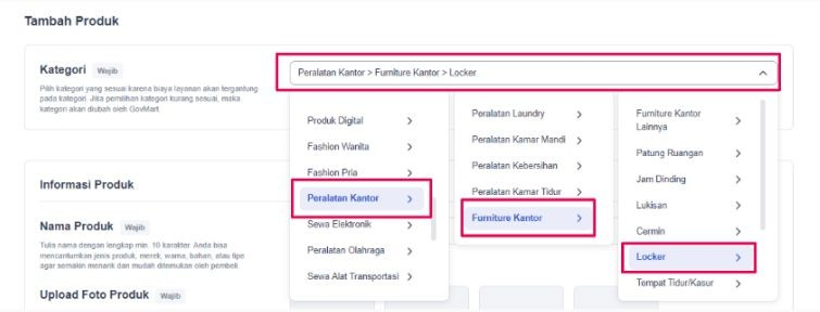 Terdapat 3 level kategori yang harus dipilih. Pastikan informasi kategori yang diisi sudah benar karena tidak dapat diubah atau diedit setelah disimpan.