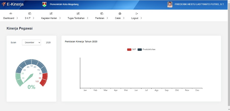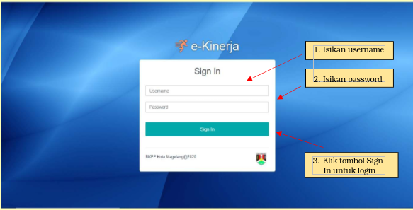 Silakan isikan username dan password yang sudah diberikan dengan benar, kemudian klik tombol SIGN IN untuk melakukan login ke dalam aplikasi E-Kinerja. Setelah proses login berhasil, maka akan tampil halaman dashboard seperti pada gambar di bawah ini.