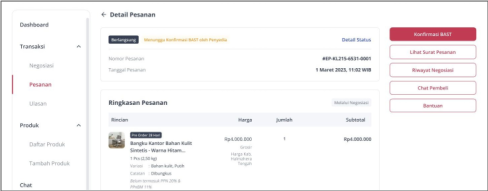 - Setelah BAST telah dikonfirmasi oleh pembeli, maka status pesanan akan berubah menjadi “Menunggu Konfirmasi BAST oleh Penyedia”